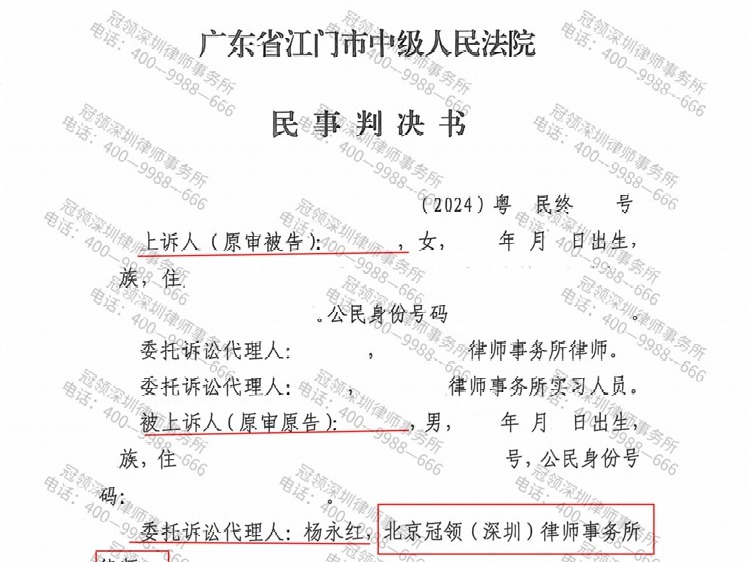 2024年5月,因邻居私自改造房屋格局,楼下吴晋的房屋遭到严重漏水。沟通无果后,吴晋求助于北京冠领(深圳)律师事务所。在冠领律师的帮助下,同年9月,双方达成调【查看全文】