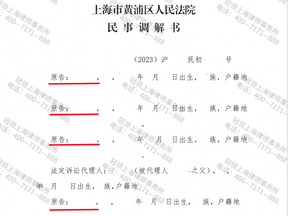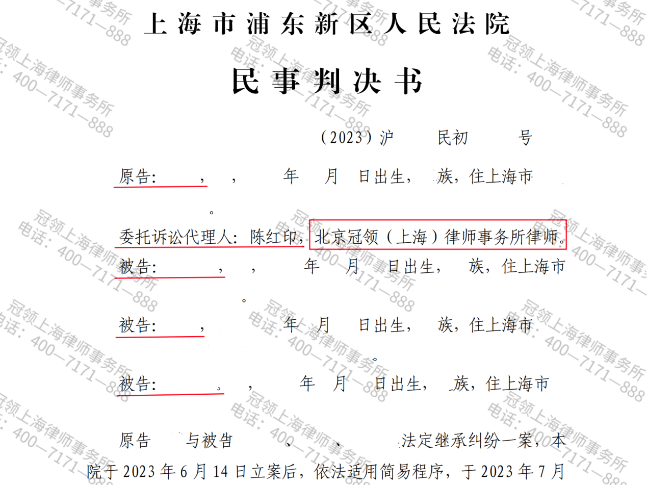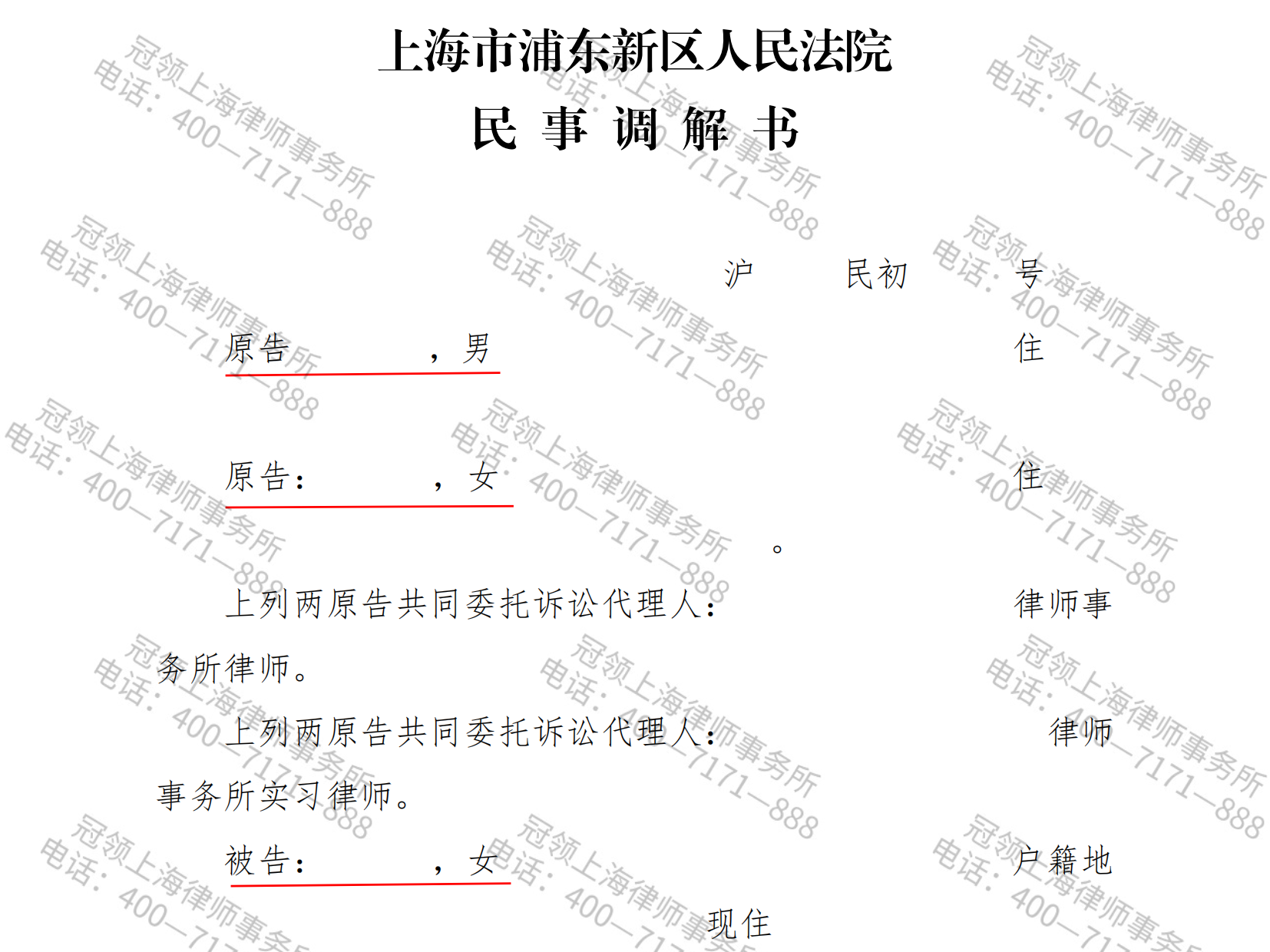 北京冠领律师事务所周旭亮主任、任战敏执行主任督导,王冬梅律师、邹海霞律师代理的上海浦东新区共有、法定继承纠纷一案,由上海市浦东新区人民法院调解并出具《民事调解书【查看全文】