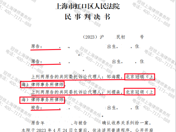北京冠领律师事务所周旭亮主任、任战敏执行主任督导,邹海霞律师、刘稷森律师代理的上海虹口确认收养关系纠纷案,经上海市虹口区人民法院审理,作出《民事判决书》,确认两【查看全文】