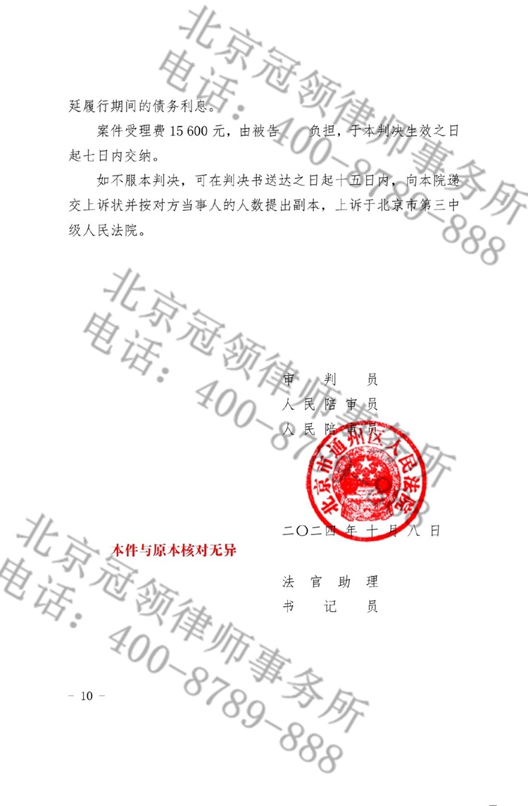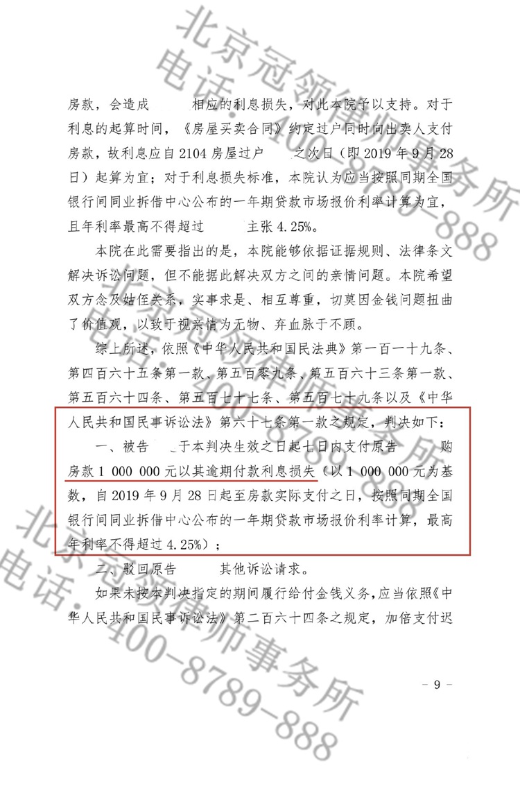 法院经审理,认定小李拖欠购房款的事实清楚,完全采纳冠领律师的主张,判决小李限期向李女士支付100万元购房款以及逾期利息。同时,法官还在判决书中发出倡议,提醒小李和李女士顾念姑侄亲情,相互尊重,莫要因利益伤了感情。