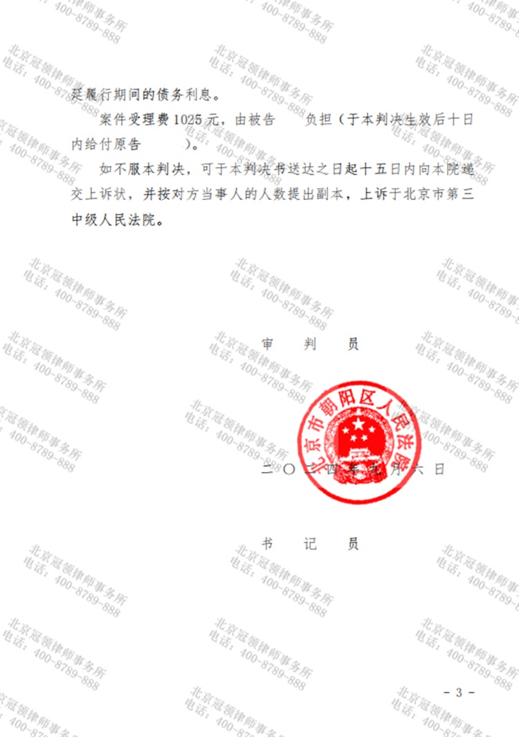 2021年2月,北京朝阳的蒋廷贞老人将9万元借予继孙温栩周转,未料还款成泡影。继孙温栩的拖欠使老人生活陷入窘迫,蒋廷贞无奈委托冠领律师代理维权。律师积极奔走,锁定证据,法院于2024年9月,判决温栩限期向蒋廷贞返还借款本金9万元。