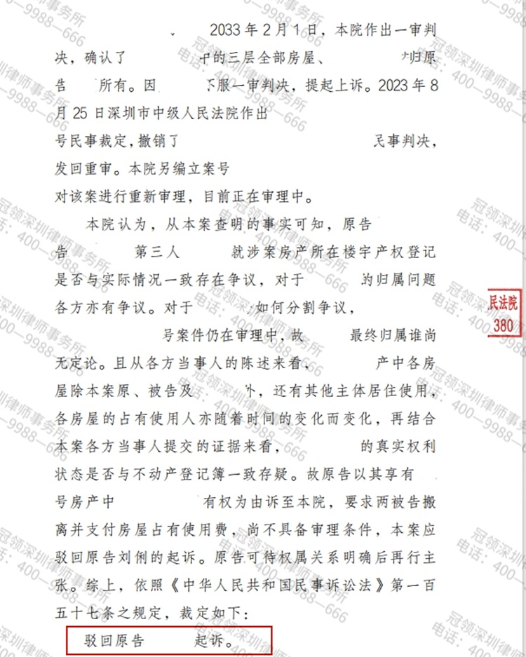 2023年,广东省深圳市的一对姐妹因一处房屋归属问题起了纠纷。双方沟通无果后,姐姐马雯(化名)将妹妹马静(化名)诉至法院。为解决此事,马静委托冠领律师代理应诉。在冠领律师的努力下,2024年8月,法院裁决驳回马雯的起诉。