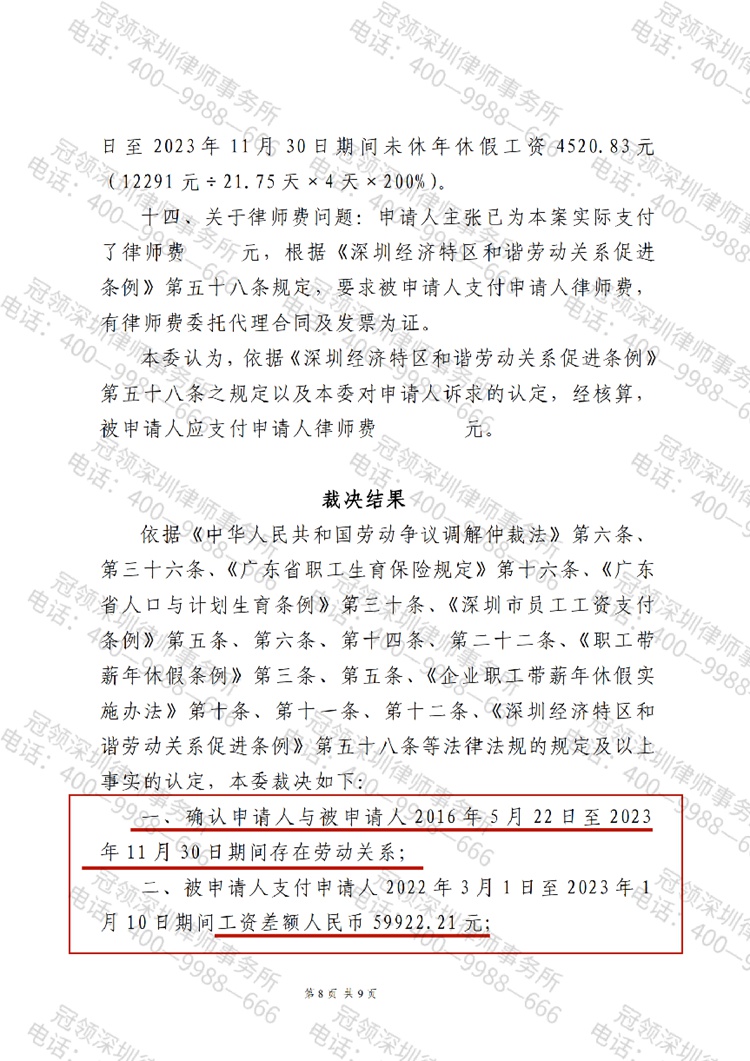 仲裁庭支持了冠领律师的意见,确认2016年5月22日至2023年11月30日期间,金梦菲与公司之间存在劳动关系,公司应当支付金梦菲工资差额、产假工资、未休年休假工资共9.7万元。目前全部款项均已执行到位。