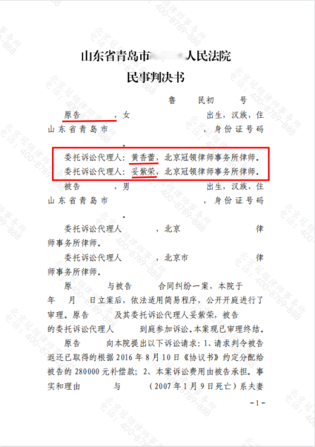 近日,北京冠领律师事务所代理的山东青岛合同纠纷案传来胜诉消息,儿子未按照家庭协议约定履行好赡养母亲的义务,冠领律师受其母亲委托向法院提起诉讼,法院判决其返还房屋拆迁安置补偿款28万元。